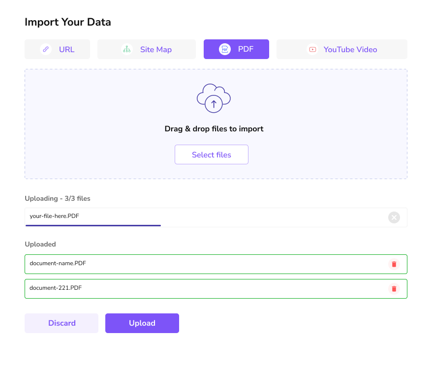 Upload your data from documents, urls and videos.