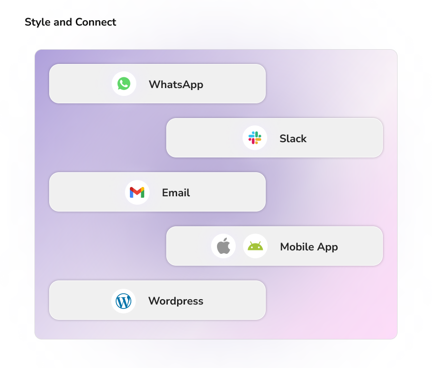 Make your agents available on the channels where your audience is active. Whether it's your Website, WhatsApp, or even Slack, Ajentic has you covered. Connect your productivity tools to your agents, ensuring you and your team are always in the loop and ready to respond.